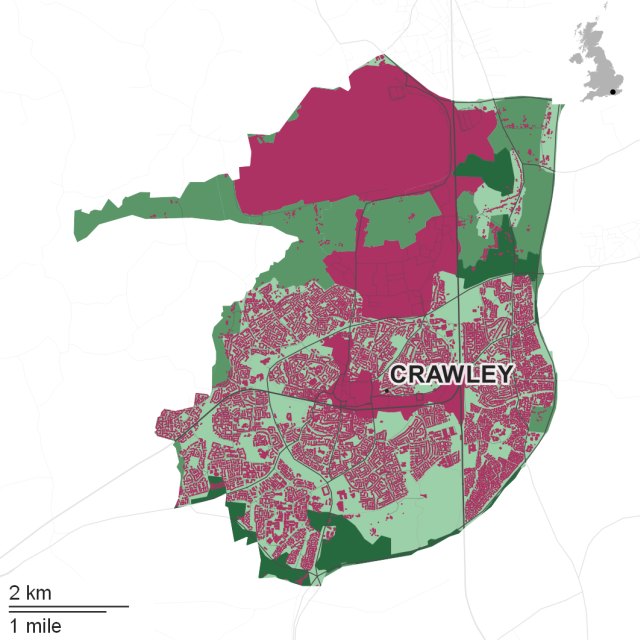 Far too often have I heard people doing the town down as some sort of concrete jungle yet, as a tool posted on BBC News today proves, what Crawley lacks in rolling fields it more than makes up for in urban green space (parks, playing fields and other patches of community greenery) with such land use over five times the national average.