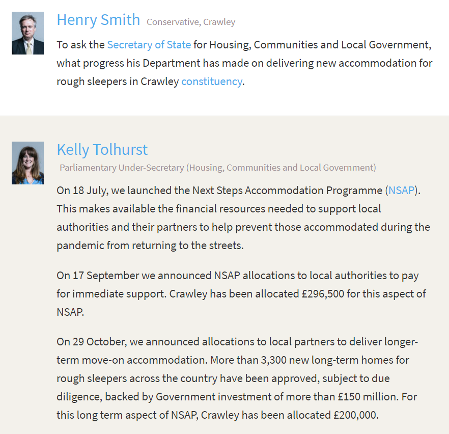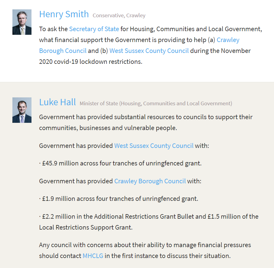 So, that’s the full picture of what is actually going on with government funding for Crawley: the government still hasn’t lived up to their promise to compensate councils for their costs involved tackling COVID-19 in the first lockdown, the grant formulas they are using mean there isn’t enough money to support our local businesses while neighbouring councils have money to spare, despite being the hardest hit economy in the country we have yet to receive any significant government support, and government grants are far too small to make any lasting impact on rough sleeping.