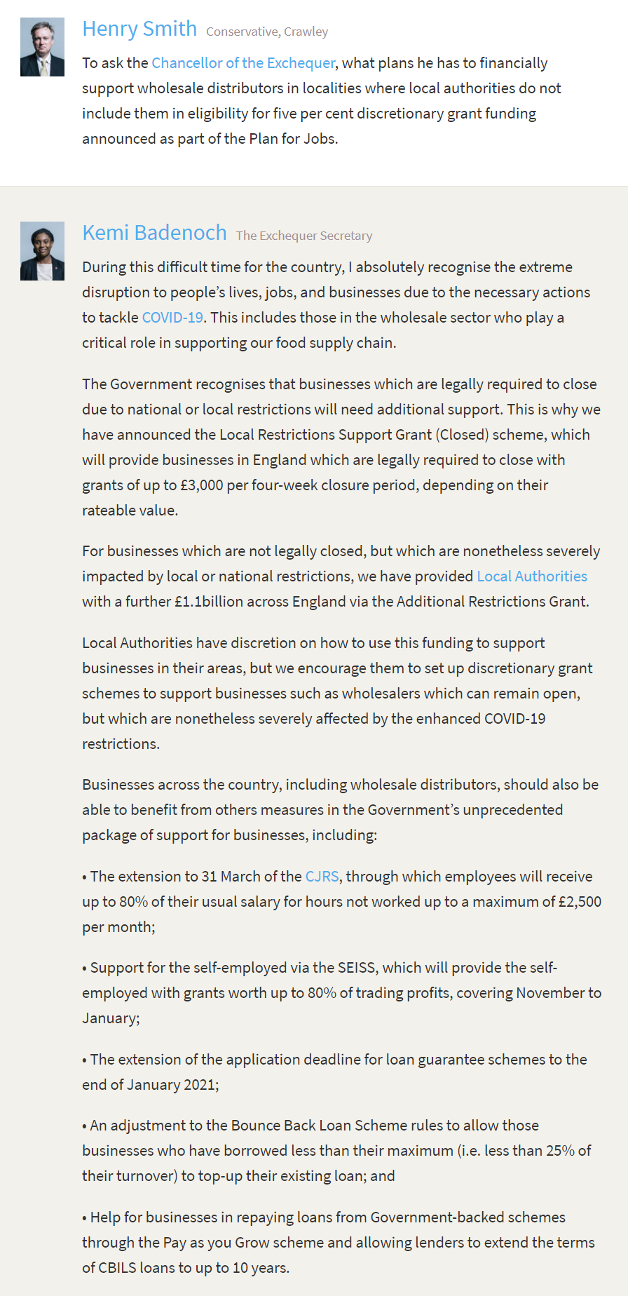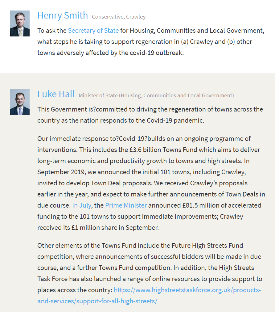 I have written about the Towns Fund previously. Before the General Election, the government committed to give a range of towns–mostly in constituencies considered to be marginal at the time–up to £25m to improve their areas. The funding has no direct connection to COVID-19, yet despite Crawley being the hardest hit economy in the UK it remains the only funding which has so far been committed for our area…fourteen months after it was first announced we still have yet to see a penny of the funding or any idea when some of the investment might head our way.