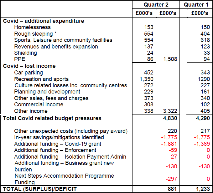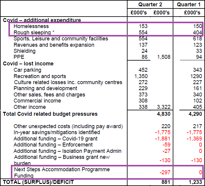 As the table shows, the council has actually received more than the government has set out, £2.4m in total, but between increased expenditure and lost income the council is £4.8m worse off. The only reason why the council is not at risk of bankruptcy right now is the action taken by the council to find £1.8m of in-year savings, but that still leaves a £900k deficit before the second lockdown began.