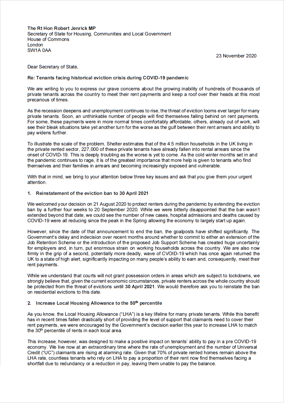 While we understand that courts will not grant possession orders in areas which are subject to lockdowns, we strongly believe that, given the current economic circumstances, private renters across the whole country should be protected from the threat of evictions until 30 April 2021. We would therefore ask you to reinstate the ban on residential evictions to this date.