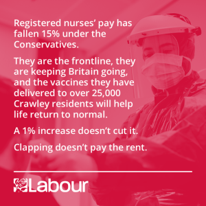 Under the Conservatives, nurses’ pay has fallen 15%. Even before the pandemic, nurses being forced to rely upon foodbanks was a national scandal, but the Government’s decision to again give them a real-terms pay cut is deeply insulting when they’ve just been through hell to beat COVID-19.