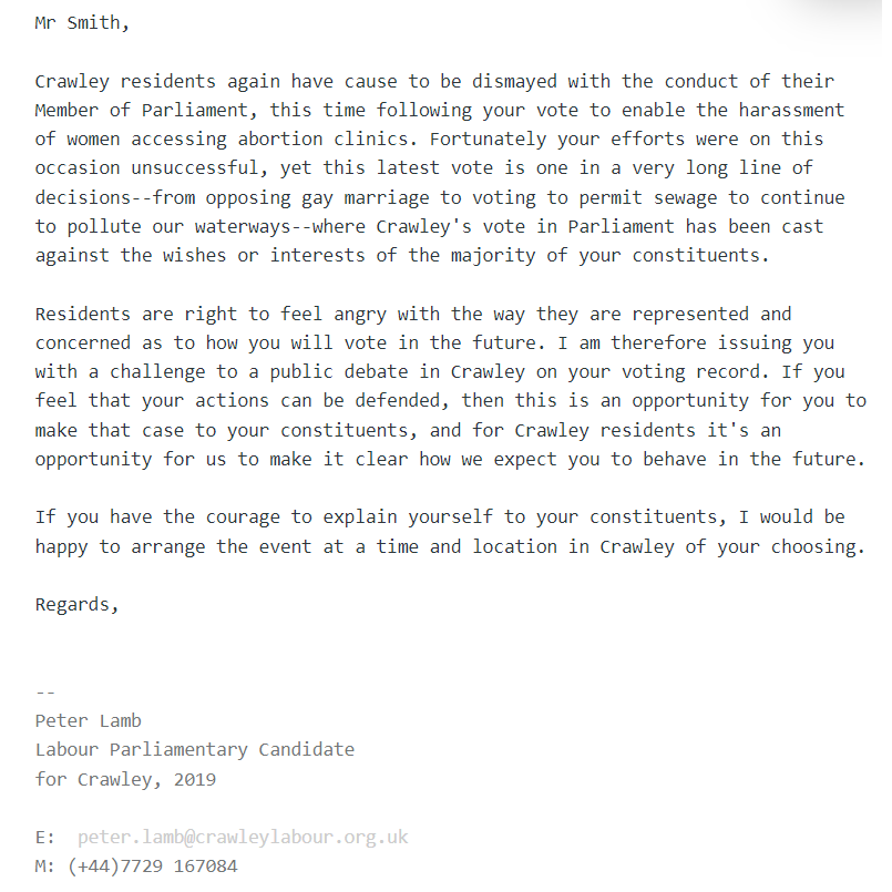 Crawley residents again have cause to be dismayed with the conduct of their Member of Parliament, this time following your vote to enable the harassment of women accessing abortion clinics. Fortunately your efforts were on this occasion unsuccessful, yet this latest vote is one in a very long line of decisions–from opposing gay marriage to voting to permit sewage to continue to pollute our waterways–where Crawley’s vote in Parliament has been cast against the wishes or interests of the majority of your constituents.