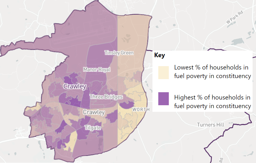 It’s worth noting that the map above compares parts of Crawley to other parts of Crawley, not the UK as a whole. When viewed in the national context, the young age of the New Town actually means we perform quite well, with only 8.2% of properties being deemed fuel poor, compared to 13.2% in England as a whole.