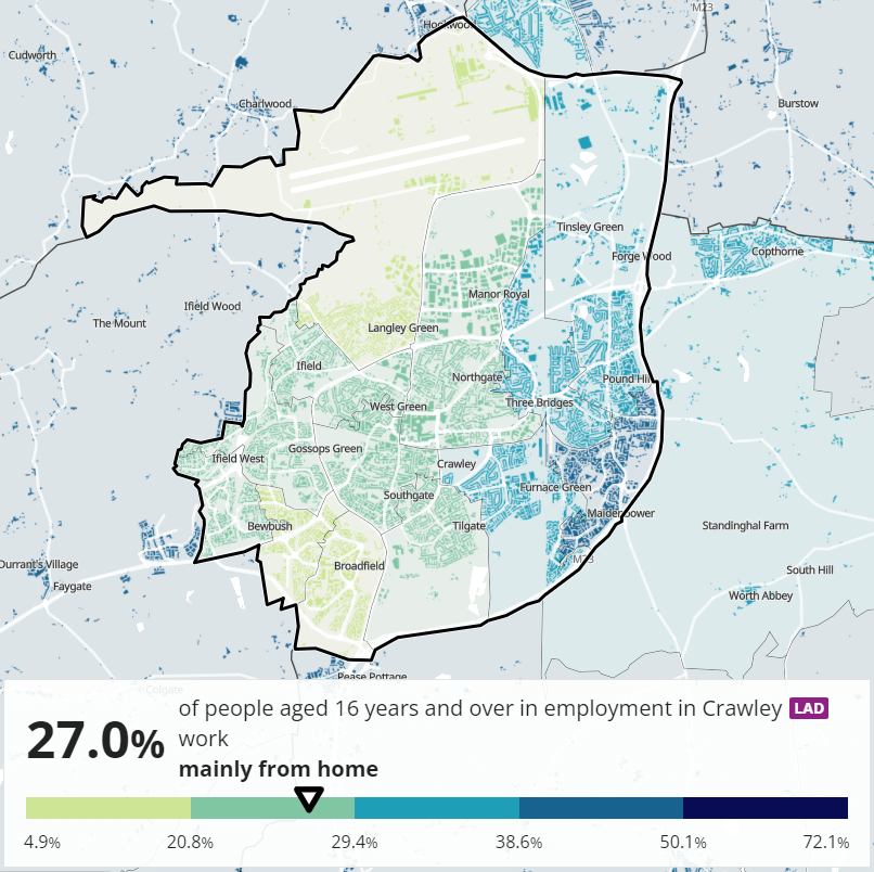 While flicking through the various questions, I was interested to come across the slides detailing average commutes for workers across Crawley, which gave the remarkable statistic that almost half of workers in one part of town largely working from home. Now, bear in mind that while this was over a year into the pandemic, we were still subject to various restrictions, but the most significant thing here is the disparity with only 16.3% of residents in Broadfield West working mainly from home compared to 42.% of workers in Maidenbower East and Worth.