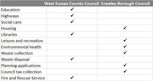 Crawley’s services are split between West Sussex County Council (which has been run by local Conservatives since 1997) and Crawley Borough Council (which has had a Labour leader since 2014), a rough breakdown of which authority is responsible for what can be found in the table below: