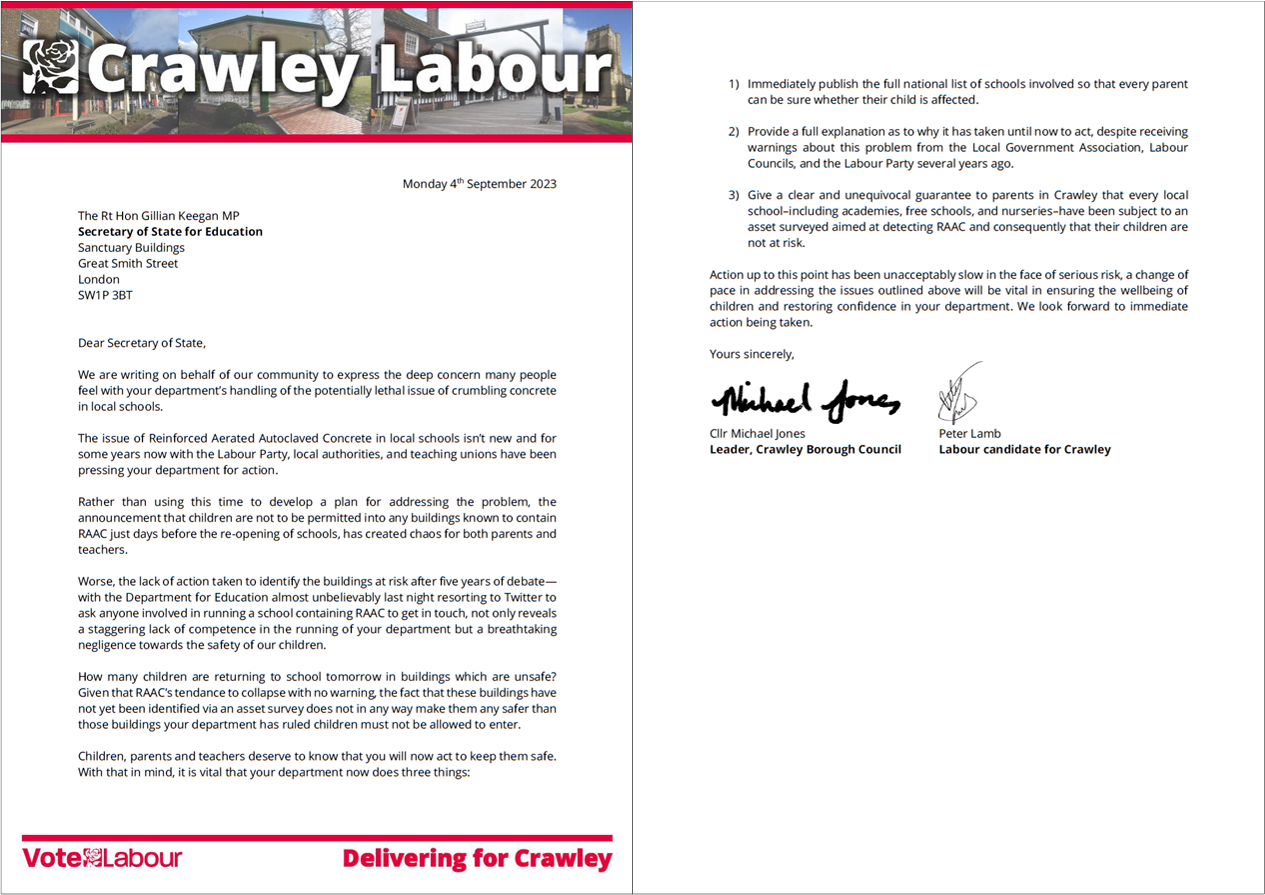 - Give a clear and unequivocal guarantee to parents in Crawley that every local school–including academies, free schools, and nurseries–have been subject to an asset surveyed aimed at detecting RAAC and consequently that their children are not at risk.