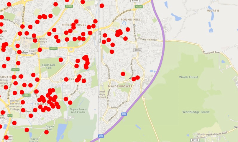 There is also a dearth of CBC land both in Maidenbower, and the Worth and Crabbet Park sections of Pound Hill. The reason for this is that these areas have largely been brought forward through private development (and even with planning permission from a neighbouring council in the case of Crabbet Park, where the land was based in Mid Sussex at the time).