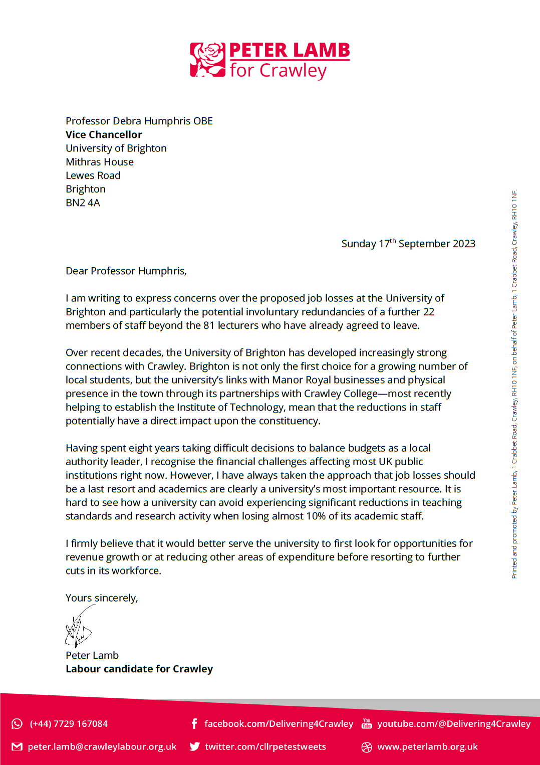Over recent decades, the University of Brighton has grown its presence within Crawley, but now job cuts threaten the continued success of the university in the area. This morning I wrote to the vice chancellor to raise concerns over the proposed redundancies.
