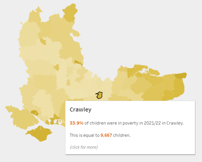 Their data reveals that before rapid inflation took hold, 9,667 children were living in poverty in Crawley, representing over a third (33.9%) of all the town’s children. Merging this with data releases from previous years, we see a definite trend emerging.