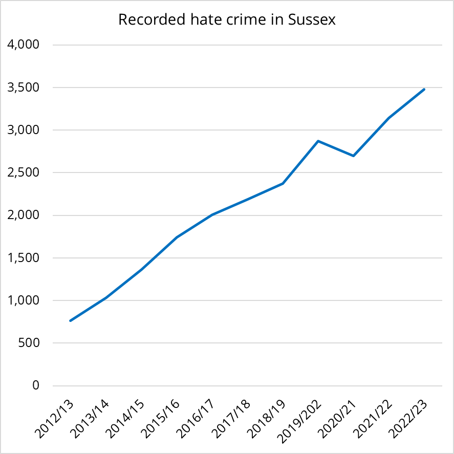 Recorded hate crime in Sussex during the period from 2012/13 to 2022/23, has grown from 766 incidences to 3,476 incidences, a staggering increase of 354%.