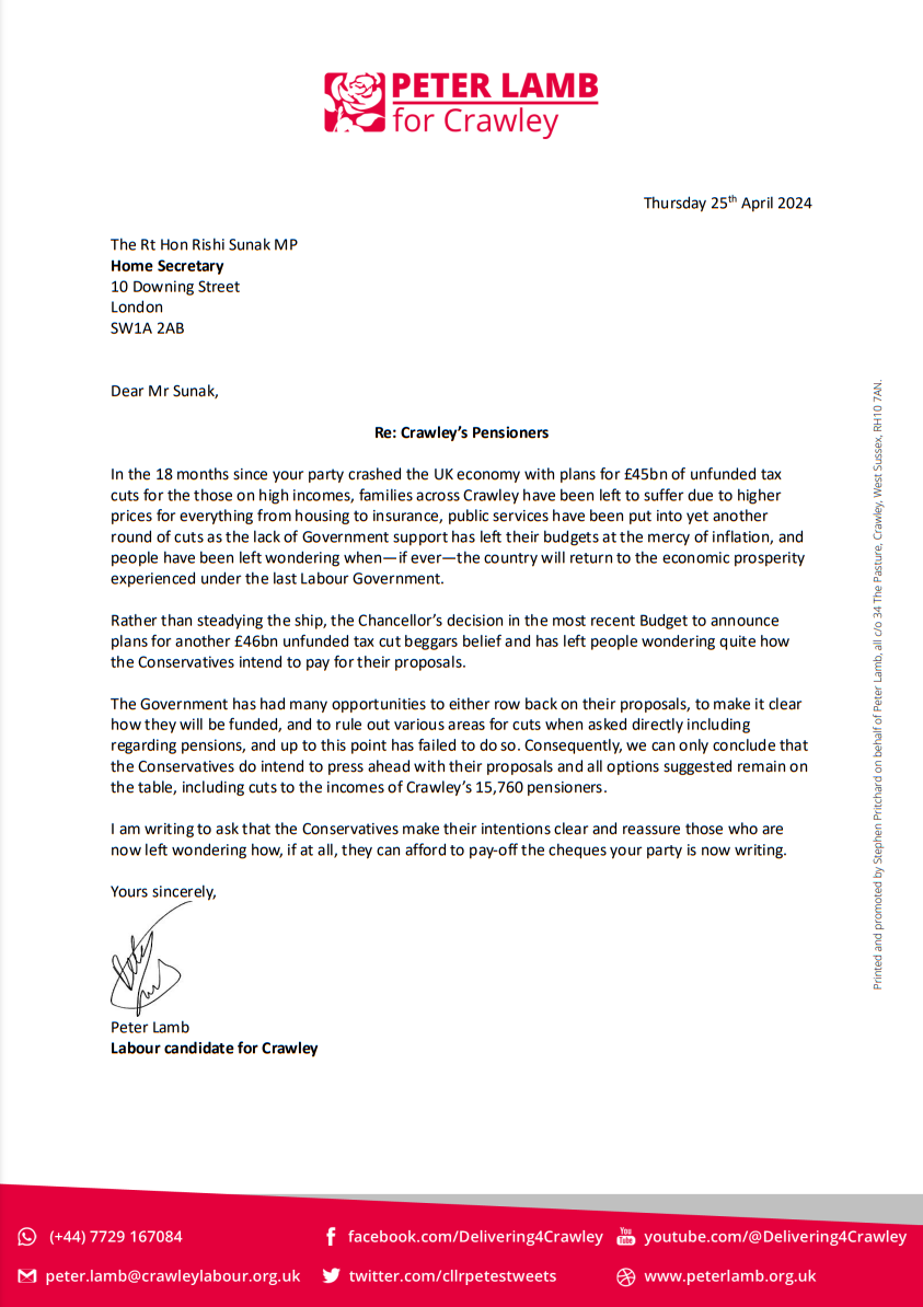 Peter Lamb, Labour candidate for Crawley, has written to Rishi Sunak to ask if Crawley’s 15,760 pensioners will be made to pay for the cost of his unfunded £46bn tax plan.