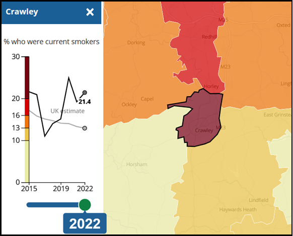 If I had to guess the reason for the changes in Crawley, I would guess that rather than large numbers taking-up smoking for the first time, it stemmed from population change, both with groups more likely to smoke from both overseas and London moving into the area.