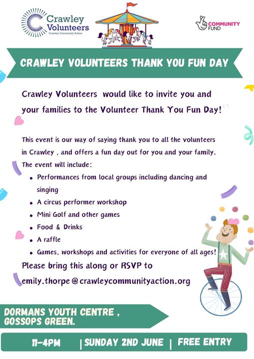 If you are looking to do more to volunteer in Crawley, Crawley Community Action–who support local voluntary groups–is a great place to start. They are also running a ‘Thank You Fun Day’ for local volunteers tomorrow at Dormans Youth Centre for anyone who is already active. Simply email emily.thorpe@crawleycommunityaction.org to RSVP.