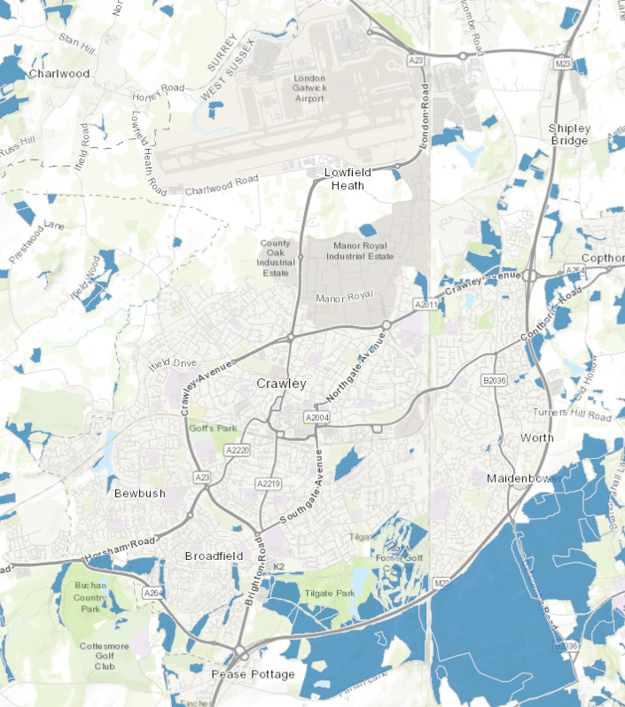 On the town’s boundary, this woodland is most heavily concentrated to the South-East, which helps to explain why development attempts have been largely concentrated to the West of the town, South at Pease Pottage (with some pretty shady behaviour by Mid Sussex enabling them to build on an Area of Outstanding Natural Beauty) and heading out East of Crabbet Park.