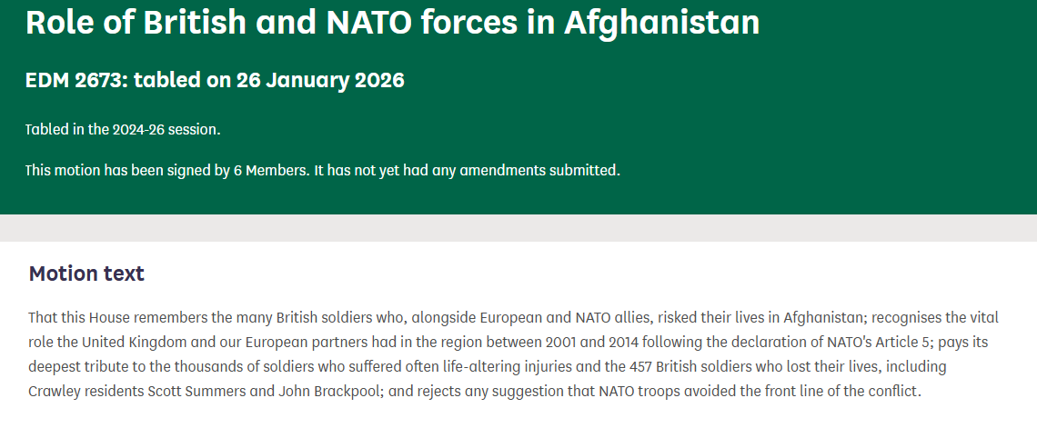 The Prime Minister was right to challenge the President over his comments and last week I moved an Early Day Motion to remember the sacrifices of forces personnel who lost their lives in Afghanistan following America’s call for NATO for support, naming Crawley’s John Brackpool and Scott Summers amongst those who served and fell.